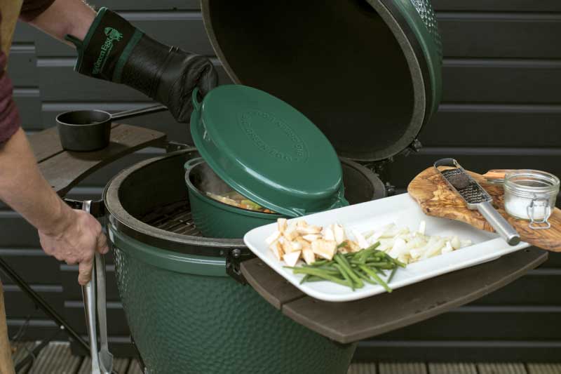 Big Green Eggi roheline haudepott on päris raske tegelane. See emailitud malmist haudepott hautab, moorib, keedab, küpsetab ja röstib. Üsna universaalne! Rohelise haudepoti kaant saab kasutada ka eraldi, näiteks madala praepannina ja isegi koogi- või magustoiduvormina. Ovaalse haudepoti maht on 5,2 liitrit.