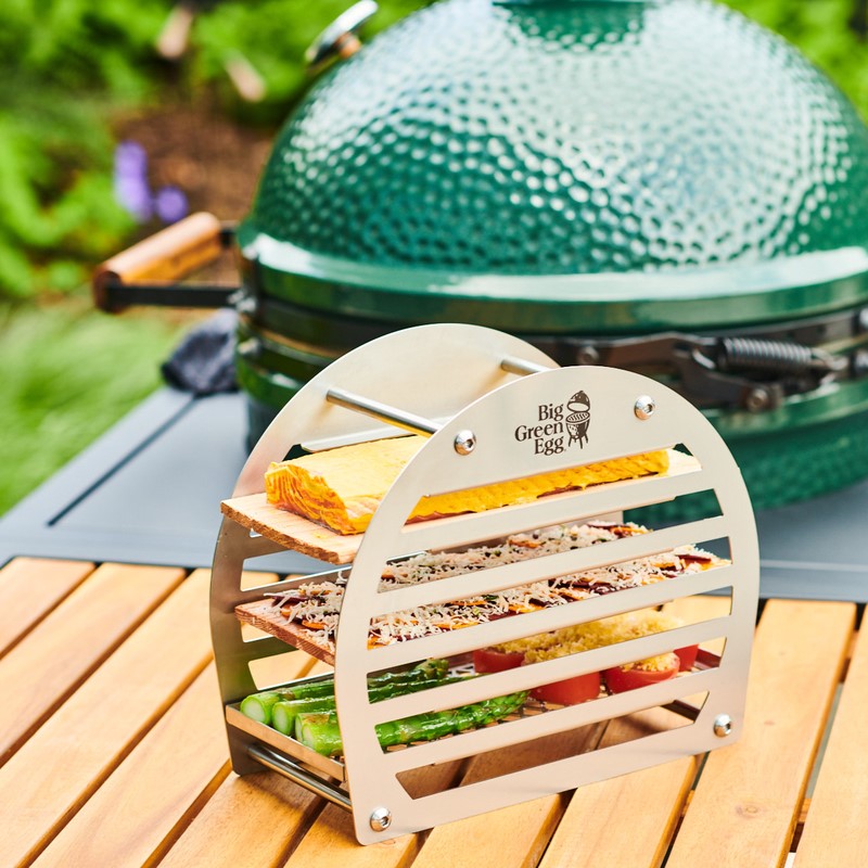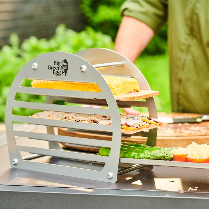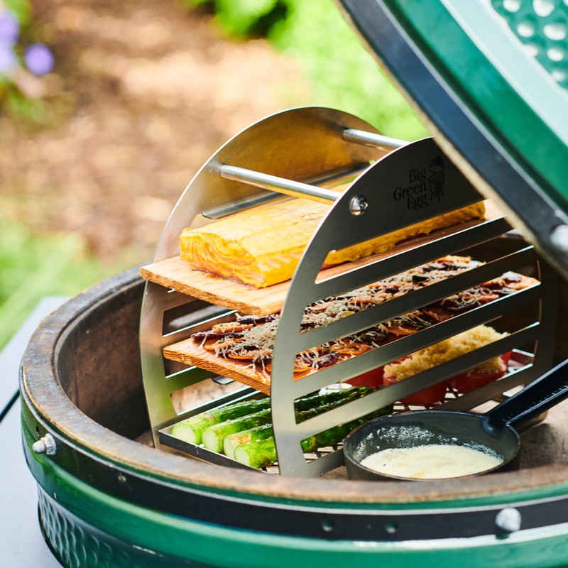 Tahad erinevat moodi suitsutada või mitmeid küpsetusviise omavahel kombineerida? Selle mitmekülgse tarviku abil on see kõik võimalik – saad küpsetada kuuel erineval tasandil. Pane näiteks ühele tasandile puuplank lõhefileega ja teisele sparglid, samal ajal kui alumisel roostevabast terasest restil küpsevad kartulid. Või valmista puidust grillalust kasutades samaaegselt erinevaid suupisteid. Soovid vorste või kala suitsutada? Saad need mugavalt suitsutorni konksude otsa riputada.