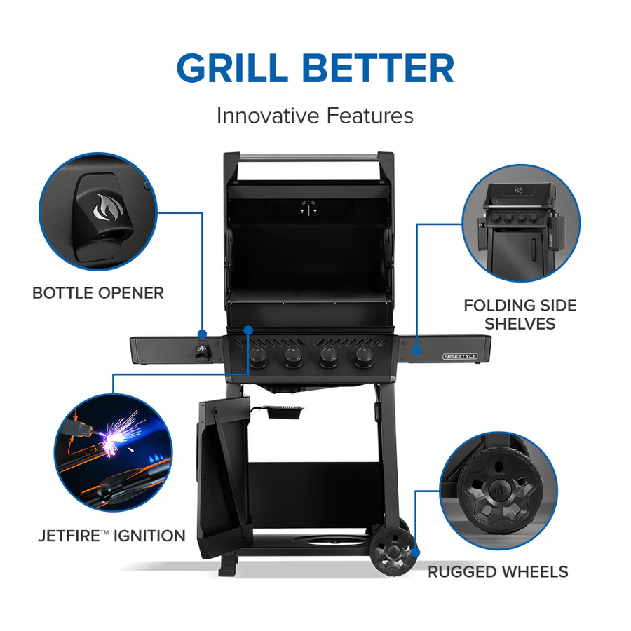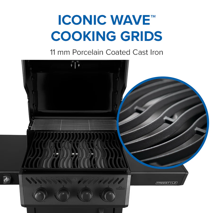 Napoleon Freestyle F425D on kompaktne, kuid üllatavalt võimekas gaasigrill, mis sobib hästi terrassile ja aeda ning annab palju võimalusi ka väiksemas ruumis. Freestyle seeria ühendab kvaliteetsed materjalid, nutikad lahendused ja 10-aastase garantii, et saaksid alustada gaasigrillimisega kindla tundega. Freestyle 425D mudelil on neli roostevabast terasest põhiküttekeha koguvõimsusega 13,6 kW, mis tähendab kiiret kuumenemist, ühtlasemat kuumust ja rohkem jõudu erinevate toitude jaoks. JETFIRE süütesüsteem süütab põletid kiiresti ja turvaliselt ning ACCU-PROBE termomeeter aitab küpsemist mugavalt jälgida. Grilli vastupidav valualumiiniumist tulekamber, roostevabast terasest kuumusejaotusplaadid ja emailitud malmist WAVE-restid loovad stabiilse ja hästi toimiva küpsetuskeskkonna. Kaks alla klapitavat külmtasapinda säästavad hoiustamisel ruumi, kapiosa pakub panipaika tarvikutele ja gaasiballoonile ning integreeritud pudeliavaja on alati käepärast. Komplektis on gaasivoolik ja madalrõhuregulaator ning lisavarustusena saab grilli täiendada näiteks söekünaga, et kasutada seda soovi korral ka söegrillina.